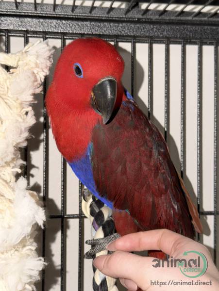 This is my seven month old, Eclectus female. She is very friendly and loves cuddles. She’s very healthy and loves to eat. She is still currently learning to talk, but she is a baby so she has a lot of time to learn. Feel free to message or call if interested.